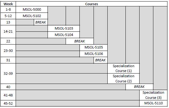 Like the non-Accelerated MSOL, students are required to complete 30 credit hours, which include 18 credit hours of foundation course work. Additionally, the Accelerated MSOL requires 9 credit hours in prescribed content courses beyond the foundation courses and a 3 credit-hour capstone program course. The second course, MSOL 5102  is staggered four weeks following the start of the first course, MSOL-5000 . The last course in the Accelerated MSOL track, MSOL 5110  starts four weeks following the start of the last specialization course. All other courses are taken in pairs (see course schedule).
